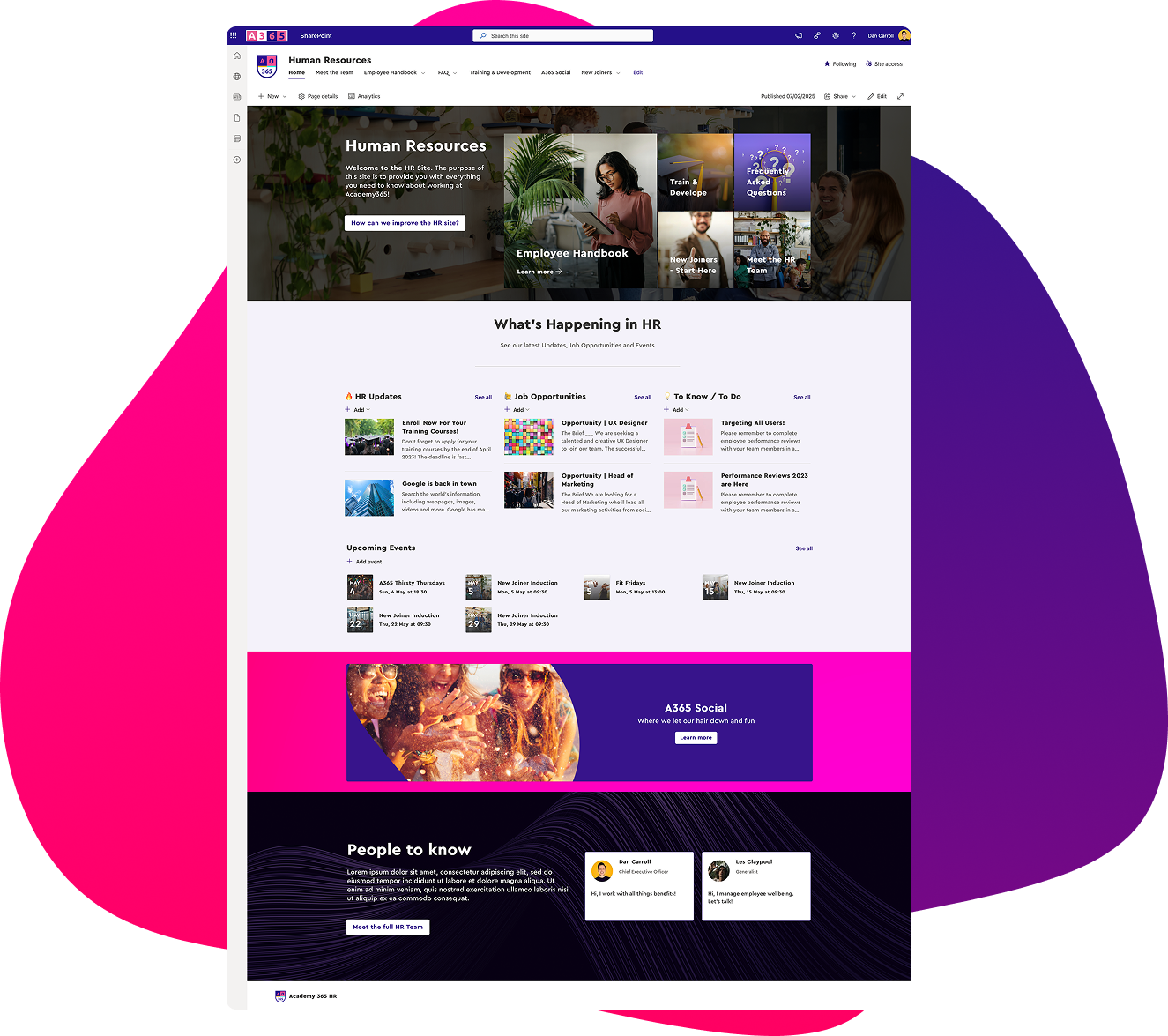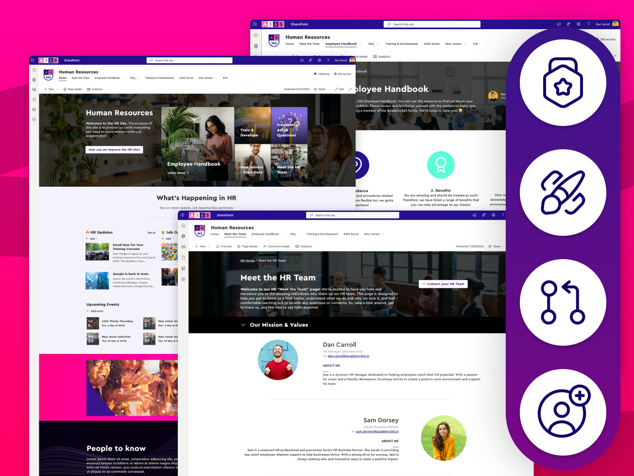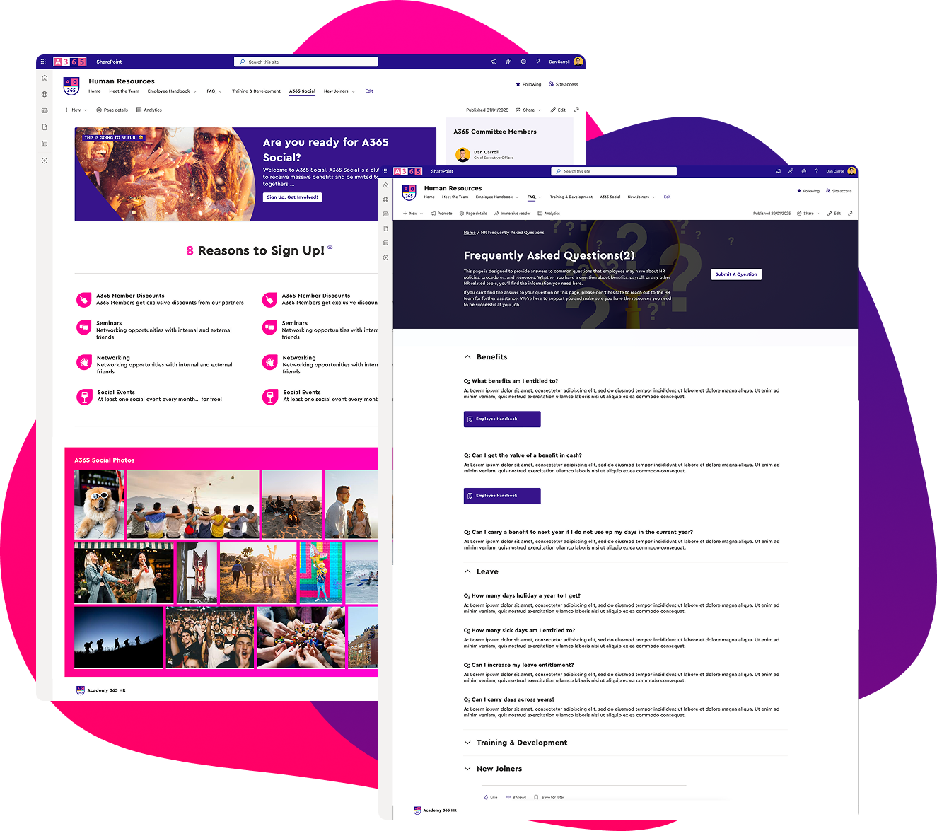 We’ll build an induction page featuring an event feed for onboarding sessions, a tailored FAQ page with filtered content for new joiners, and a useful links page using different web parts for easy navigation.